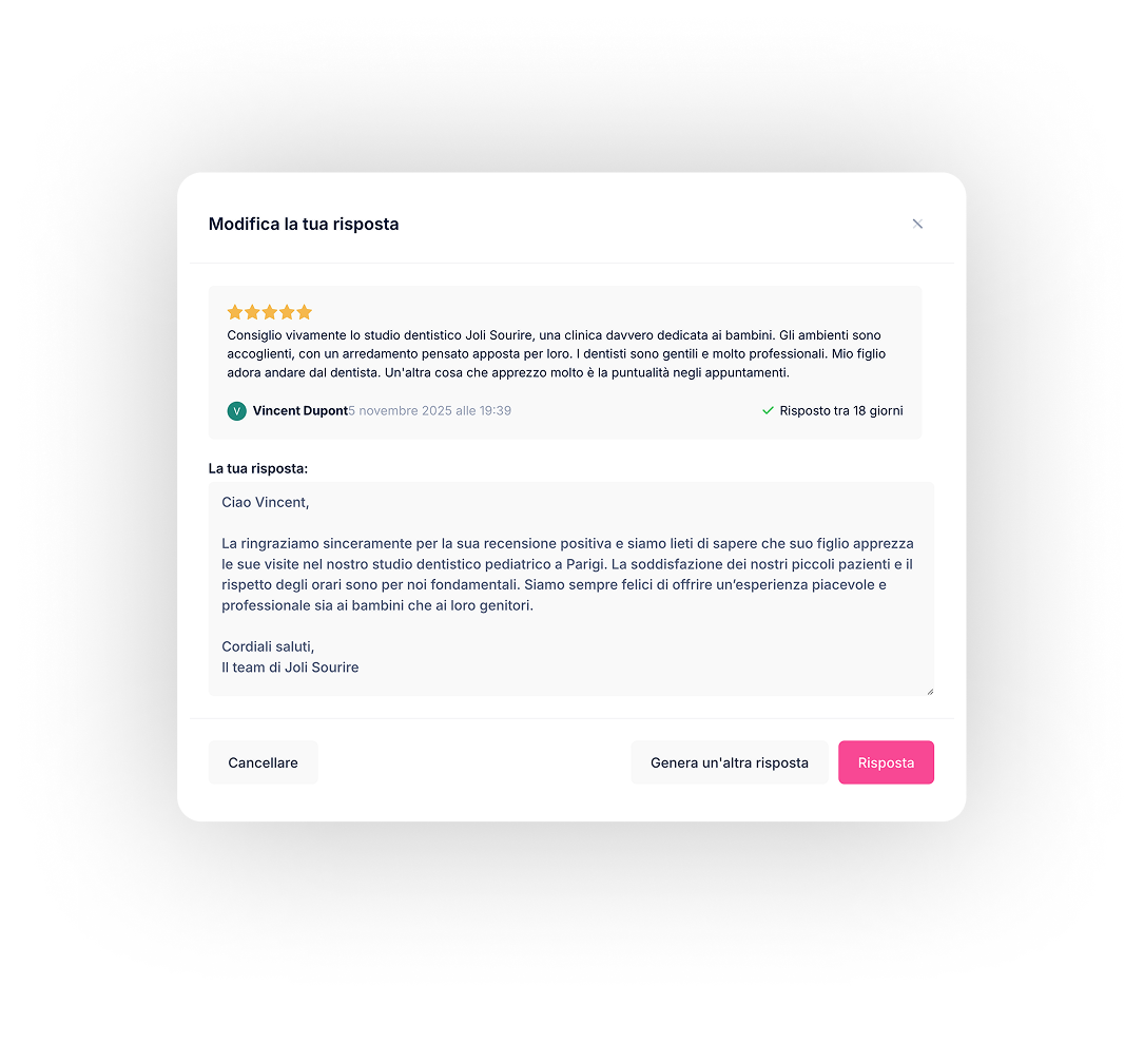Risposte alle recensioni generate automaticamente, personalizzate in base a tono, contesto e linguaggio, con integrazione automatica delle parole chiave per migliorare la SEO locale. Rispondere alle recensioni non è mai stato così facile e veloce.